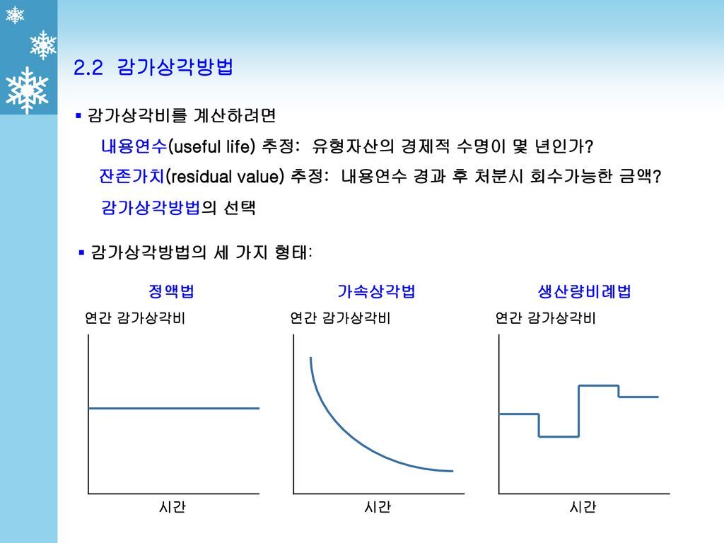 세 번째 방법인 연수합계법은 매년 다른 상각률을 적용하여 감가상각비를 계산합니다. 이 방법에서 감가상각비는 취득원가에서 잔존가치를 뺀 후에 해당 연도의 상각률을 곱하여 계산됩니다.