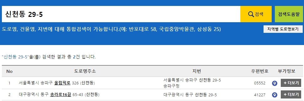 예시로 송파구청의 옛 주소인 신천동 29-5를 검색해 보았더니, 두 개의 결과가 나오는군요. 대구에도 신천동이 있었군요. 아무튼 송파구청은 신천동 29-5라는 옛날 주소에서 새 주소인 올림픽로 326으로 나오고 우편번호 5자리 05552도 나오는군요.