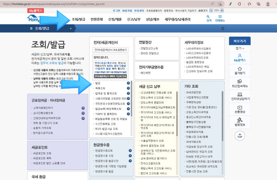 첫 번째 조회/발급 메뉴를 클릭해주세요!